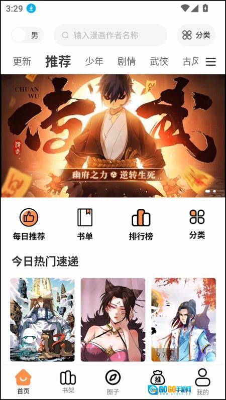 1、在软件首页下,我们能够看到更新、推荐、少年、剧情、武侠、古风等一系列板块。