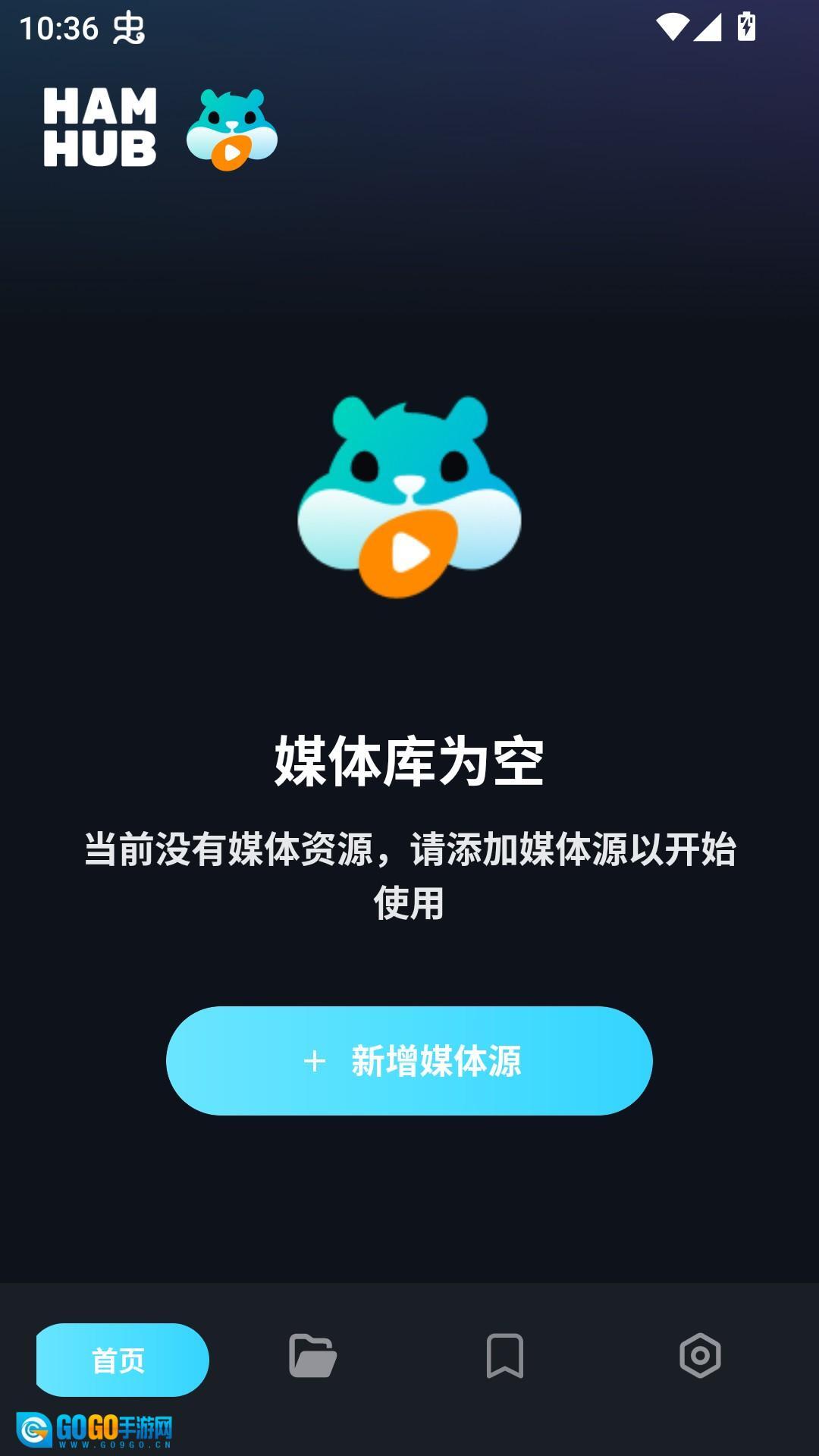 1、首先在开心电玩并安装Hamhub安卓TV版,安装完成后在首页选择增加新媒体源。