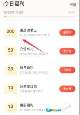 阅读时长:读书满60分钟,完成“谁是读书王”任务,获得200搜豆。