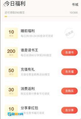 5、获取的搜豆可用于兑换购买阅读权限,为爱书人士提供省钱的阅读方式。