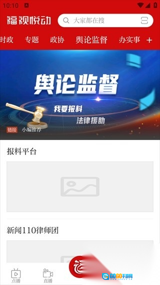 进入【福视悦动】首页后,您可以浏览【舆论监督】等板块的内容,接着点击底部导航栏中的【我】,就能进入个人功能页面了。