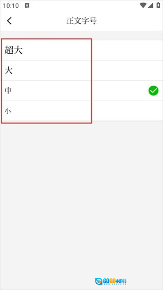 4、进入【正文字号】页面后,可选择【超大】【大】【中】【小】字号,按需调整,当前默认选中的是【中】字号。