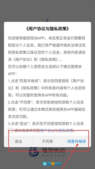 1、打开【福视悦动】应用后,仔细阅读【用户协议与隐私政策】,在勾选“同意”选项后点击【同意并继续】按钮,就能解锁并使用软件的全部功能。