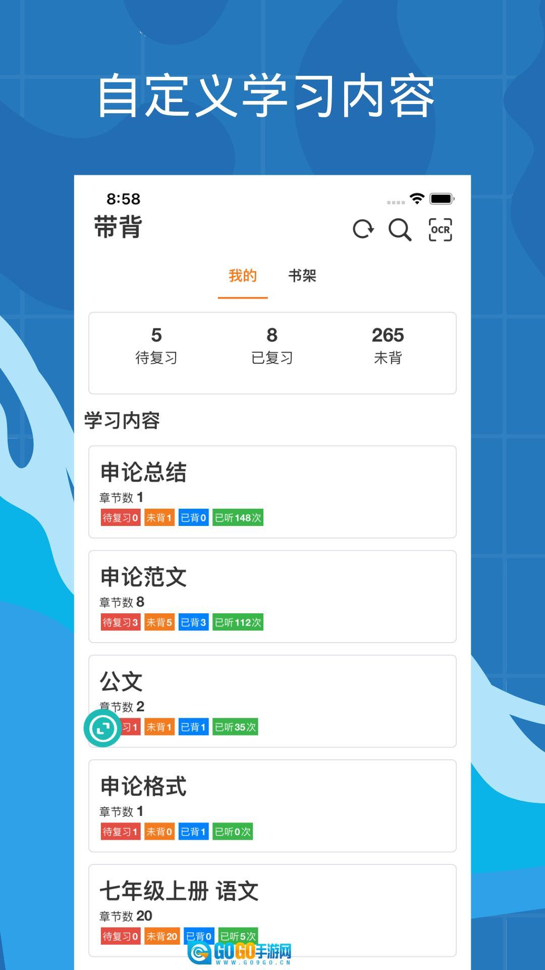 2.多种记忆模式:带背提供多种记忆模式,如图片记忆、音频记忆、视频记忆等,满足用户不同的学习需求。