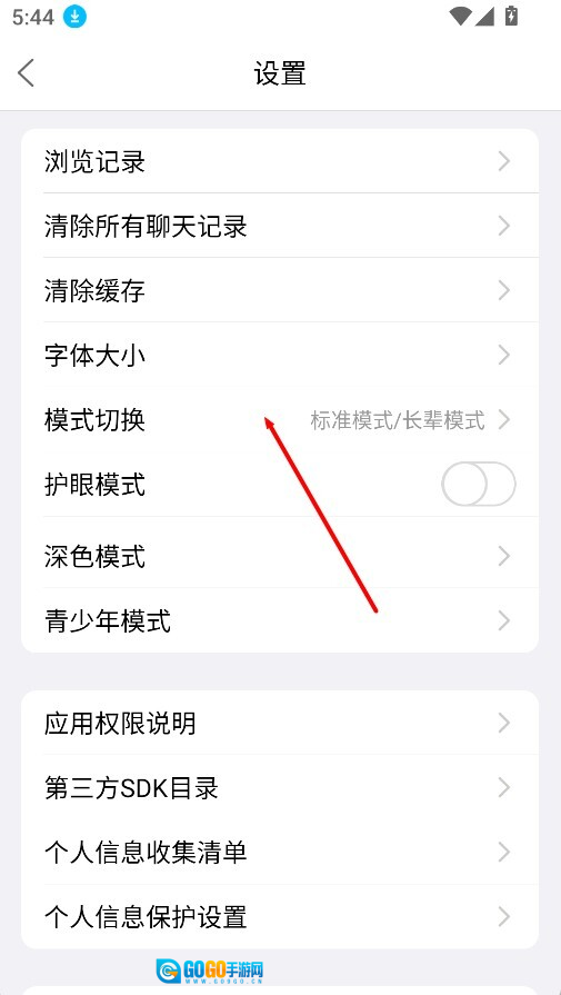 3、进入设置页面后向下滑动,找到“模式切换”选项,把当前模式切换成“长辈模式”,这样界面内容和字体就会自动调整为方便长辈阅读的样式。