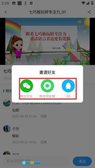 4、在邀请好友的弹窗里,可选择【微信好友】【微信朋友圈】或【QQ】来分享课程。