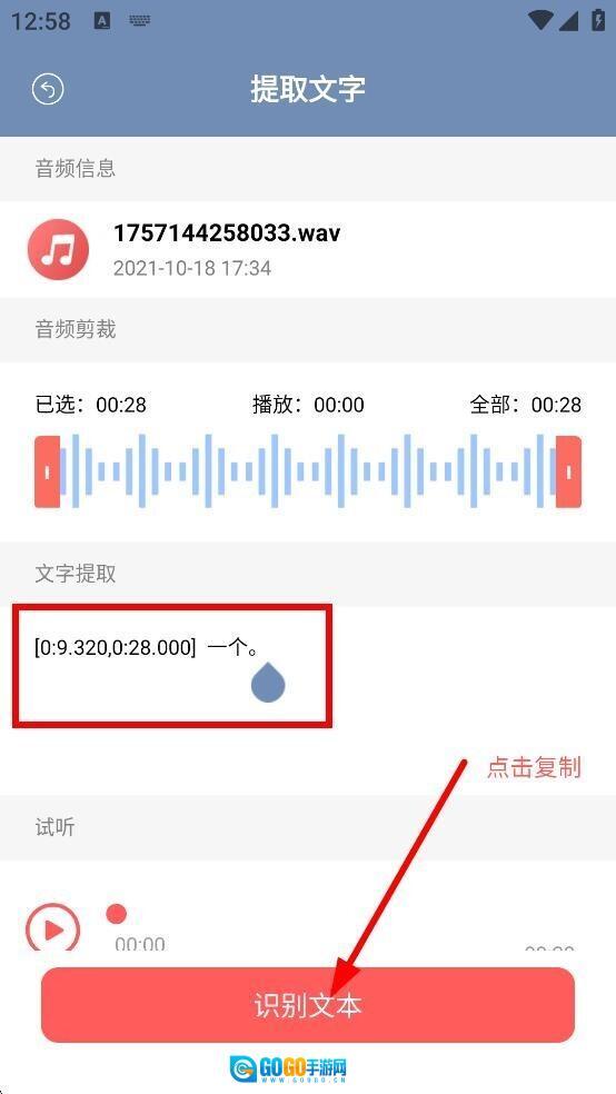 4、授权后选择音频,点击识别文本,提取音频中的文字。
