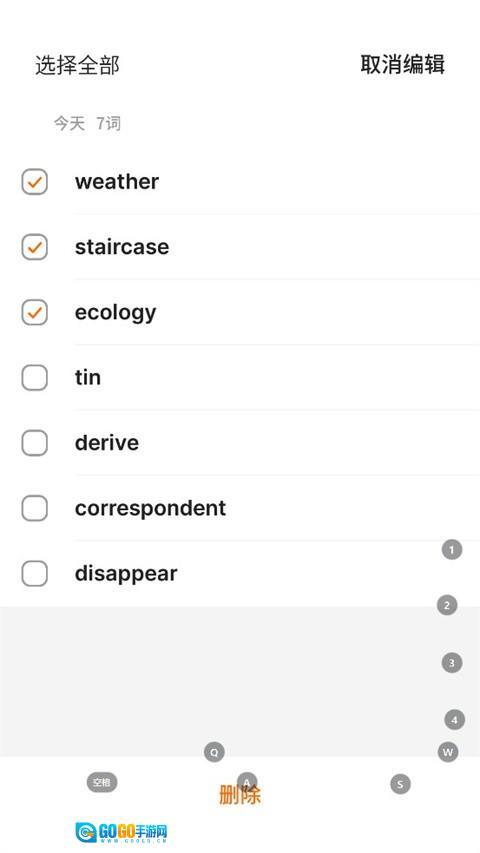 4、选择生词并勾选,单击删除即可。