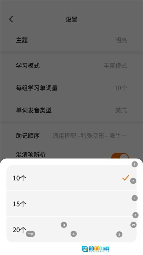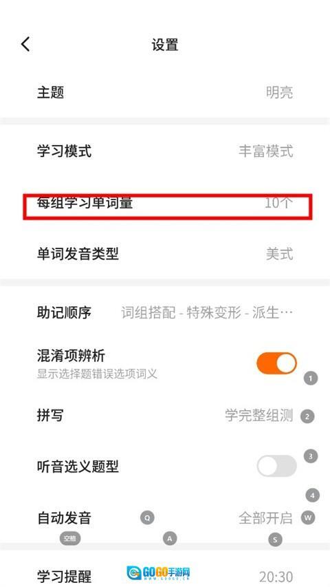 3、在设置菜单中,点击【每组学习单词量】