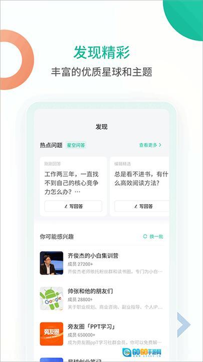 专业便捷的知识星球软件是以知识变现为核心的社群分享工具,聚合了大批工匠、设计师、音乐人、摄影师、艺术家等创作者,为用户带来高质量的专业内容。粉丝不仅能实时与圈主互动,还能通过付费获取长期价值内容,轻松结识志同道合的伙伴,分享资源与意见,让知识实现裂变与增值。知识星球软件支持文字、图片、文件、音频等多种形式的内容发布,并可加标签、设置精华、布置作业,长期保存资料,帮助创作者更运营社群。
