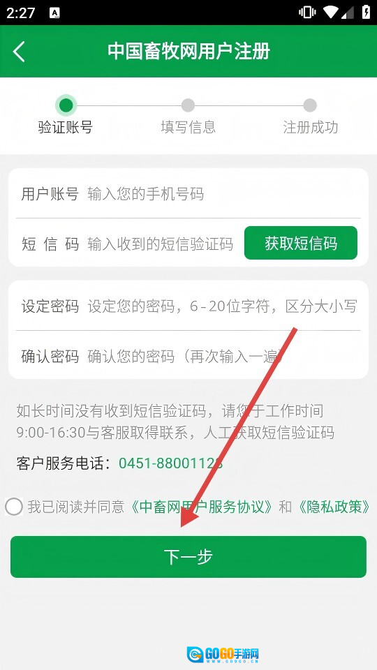 4、在【中国畜牧网用户注册】页面,填写相关信息,勾选同意相关协议后,点击【下一步】,继续完成注册。