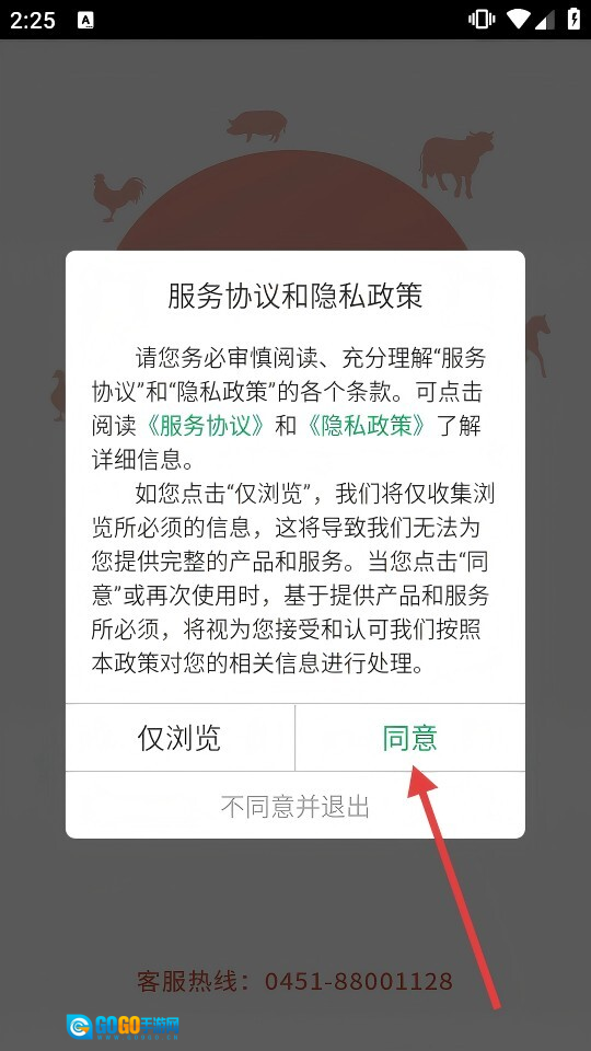 1、首次打开,仔细阅读【服务协议】和【隐私政策】后,点击【同意】,进入主界面。
