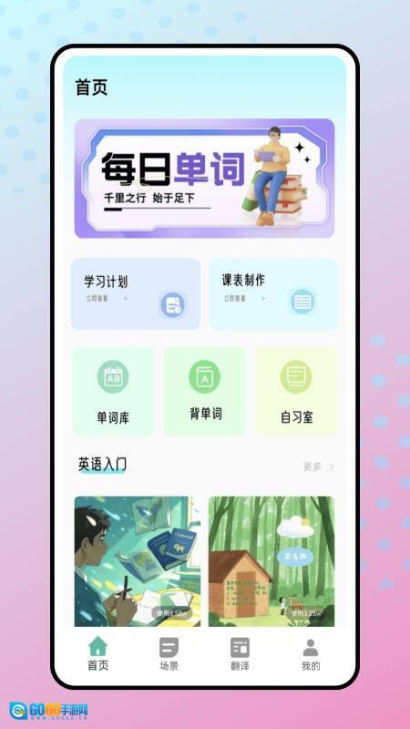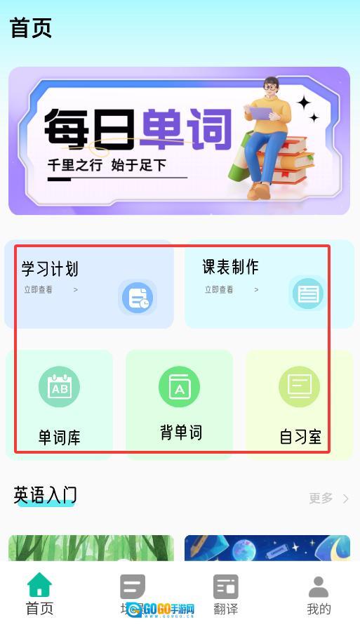 2、首页提供五大核心功能:个性化学习计划制定、课程表编排、分级词库管理、智能背单词及线上自习室。
