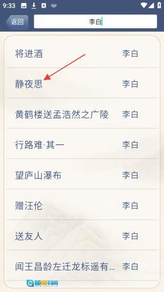 2、搜索【李白】后,在结果列表中点击【静夜思】,进入该作品详情页。