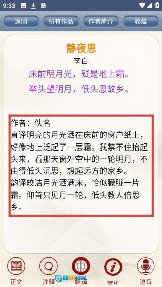 4、查看《静夜思》译文时,可直接阅读页面红框内的翻译内容。