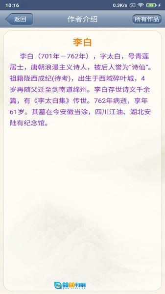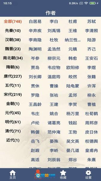 1、资源收录系统:从先秦到清代的诗词作品系统收录,计4200余首,涵盖748位诗人代表作,完整覆盖各朝代经典文学脉络。