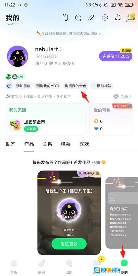 1、打开回森唱歌软件,点击【我的】-【测测我的音色】;