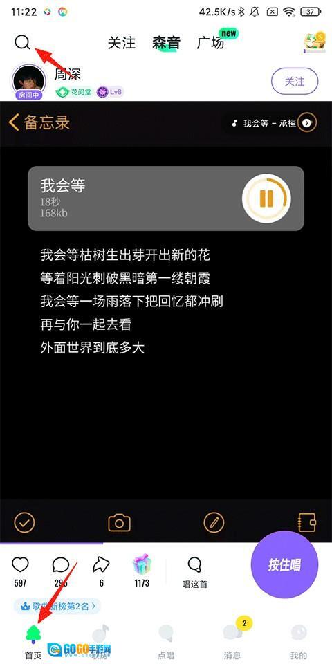 1、打开回森唱歌软件,点击【首页】-左上角的【搜索】按钮;