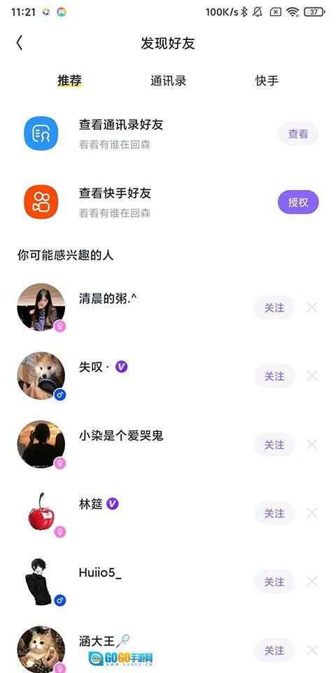 2、在【发现好友】页,选择需要好友渠道:通讯录/快手/可能感兴趣的人;
