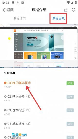4、切换至【课程目录】,点击【HTML的基本概念】进行学习。