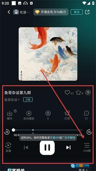 3、进入音频播放页面后,您可以使用缓存、自动播放等功能,并且还能解锁完整内容进行收听。
