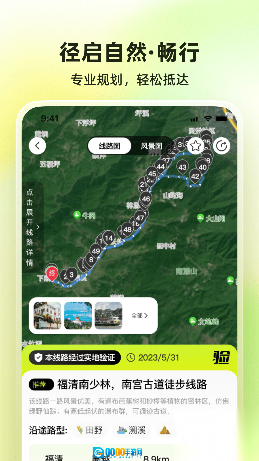 汇集各地经典与小众路线,可查看详细路线介绍、难度评级和导航指引,方便规划行程。