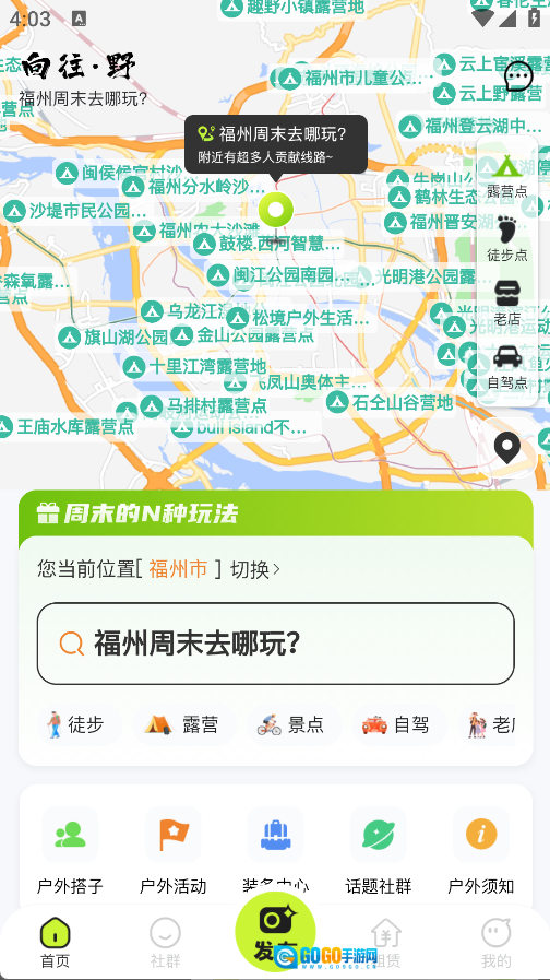 在首页随时能搜索周末适合玩游戏的各个去处,这里提供多种不同选择,还能找到户外搭子一起玩。