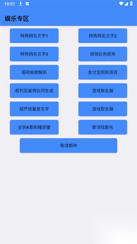 在娱乐专区的页面里,配备了像特殊网名文字、支付宝到账语音、游戏取名器这类具有实用性的功能。