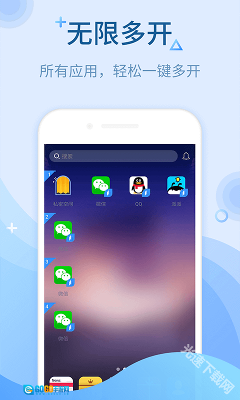 双打开、拆分、多打开应用,一键添加桌面快捷方式,任意更改微信、QQ等应用名称、图标,全部自定义。