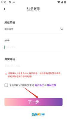 3、不管选择哪种注册方式都一样哦,大家在这里填写院校、学号和真实姓名,然后点击下一步完成注册就可以啦!