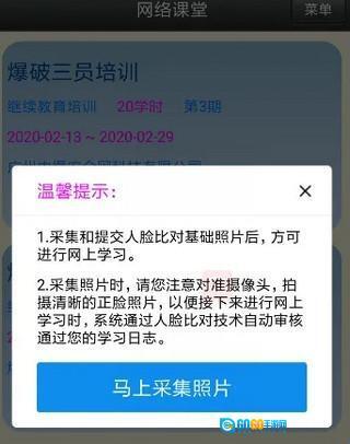 5、选好后,点击【网上学习】进去,出现采集照片的提示,点击【马上采集照片,进行照片采集,如图所示: