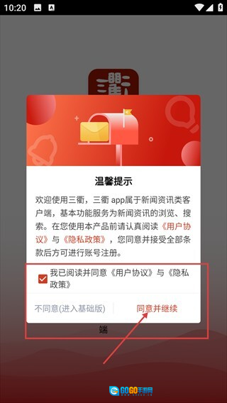 1、进入【三衢】后,勾选已同意【用户协议】与【隐私政策】,点击【同意并继续】,即可进入软件并准备账号注册。