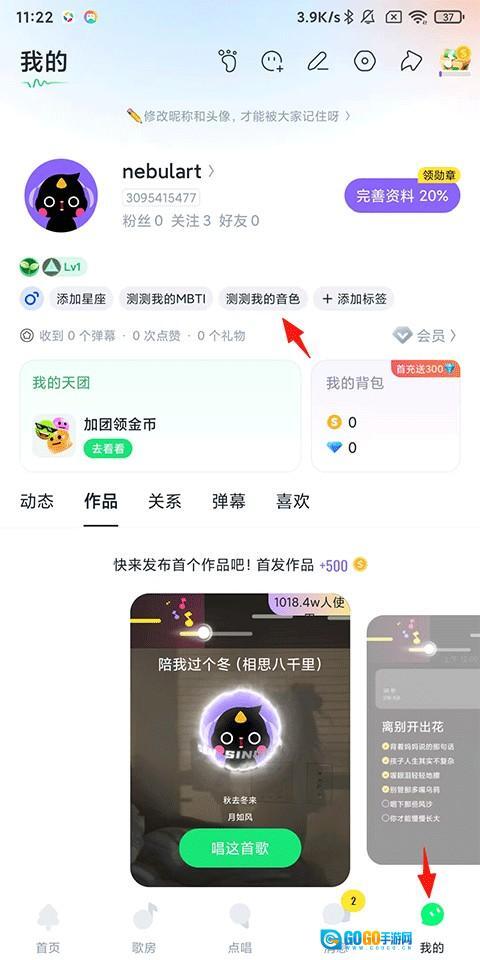 1、打开回森最新版本唱歌软件,点击【我的】-【测测我的音色】;