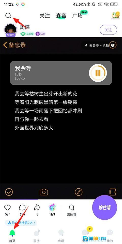 1、打开回森唱歌软件,点击【首页】-左上角的【搜索】按钮;
