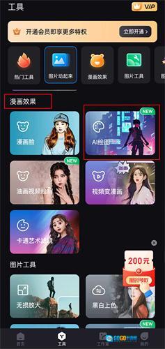 在工具列表里滑动找找,看到【漫画效果】没?点进去就能发现新大陆——【AI绘画】按钮就在里面!这一步记得看准图标。