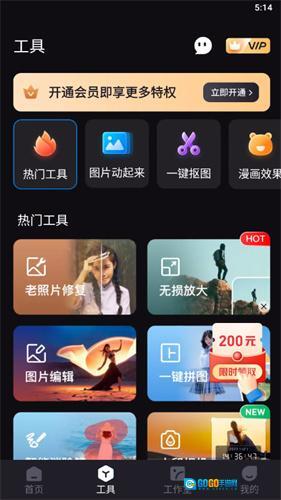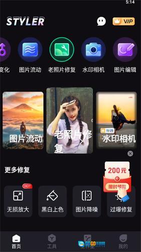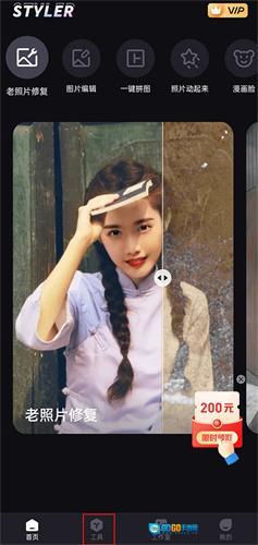 先把Styler照片修复免费版安排上,打开后底部菜单栏有一排工具图标,直接戳中间的【工具】模块进入功能区。