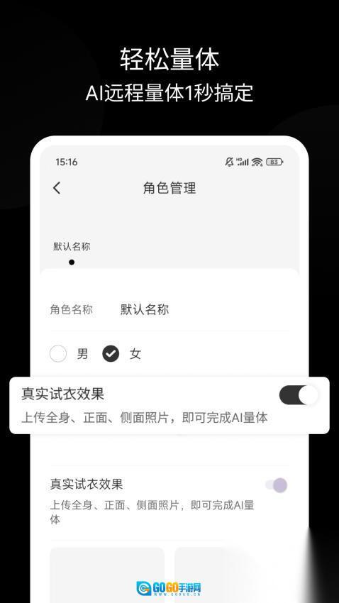 用户能够自主设置并管理专属虚拟角色,可挑选性别、查看试衣效果,进而找到心仪的服装。
