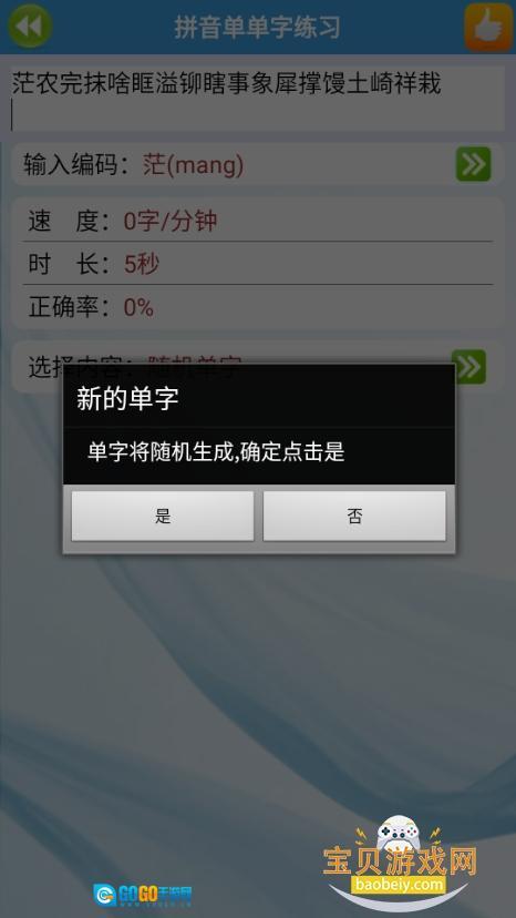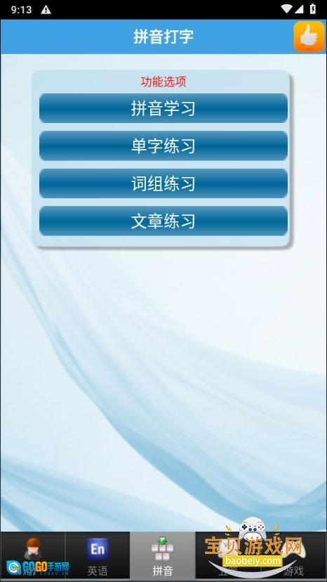 3、点击屏幕下方的拼音按键,即可进入拼音打字的练习界面,可以进行拼音、单字、词组、文章练习。