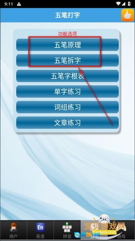 4、点击屏幕下方的五笔按键,即可进入五笔打字的练习界面,可以进行拼音、单字、词组、文章练习,也可以了解五笔原理,五笔拆字,五笔字根表。