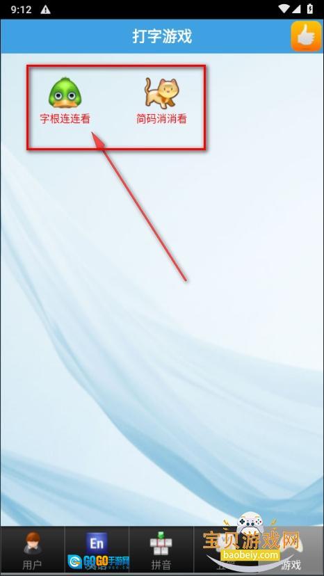 5、点击屏幕下方的游戏按键,即可进入游戏打字的练习界面,有字根消消看和简码消消看两个游戏等你来玩。
