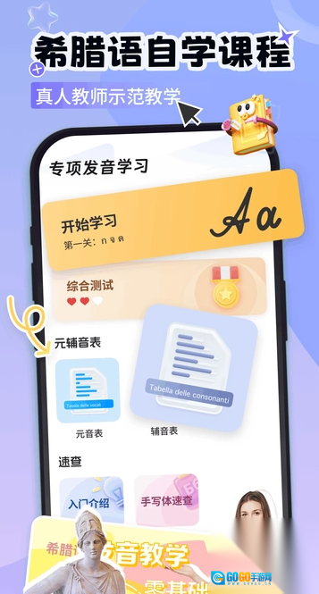 在基础学习部分,我们为学习者准备了标注标准希腊语发音的字母表学习材料,并且配有直观生动的发音口型演示动画。