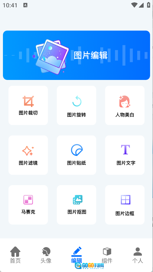 在编辑页面中提供图片裁切、图片旋转、人物美白、图片滤镜、图片贴纸、图片文字等功能。