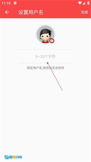 4、进入设置用户名的页面后,需填写3-20字符的用户名(一旦保存便无法修改),随后点击【完成】按钮,即可完成注册流程。