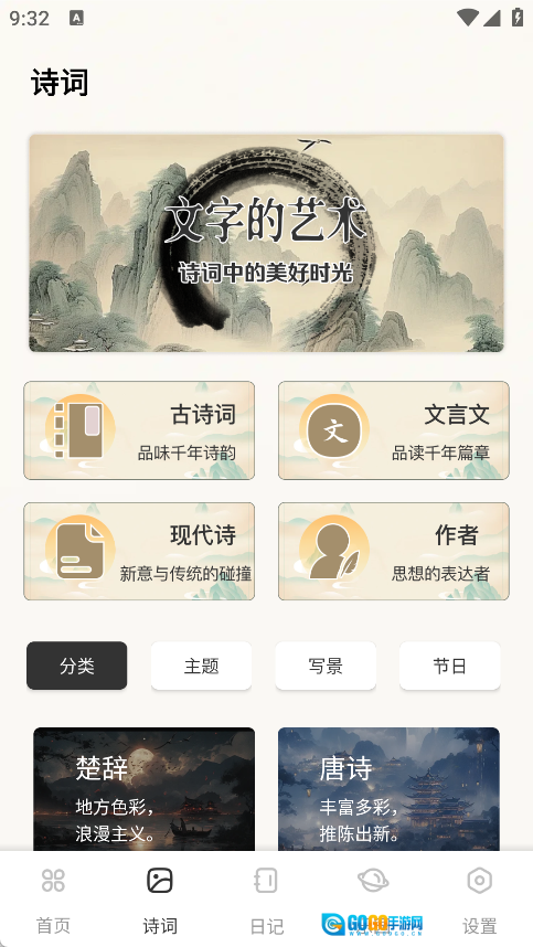 诗词页面设有古诗词、文言文、现代诗、作者等版块,同时包含丰富多样的分类。