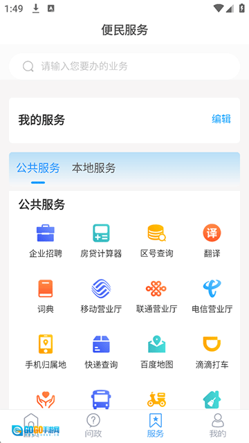服务页面提供企业招聘、房贷计算器、区号查询、翻译等公共服务。