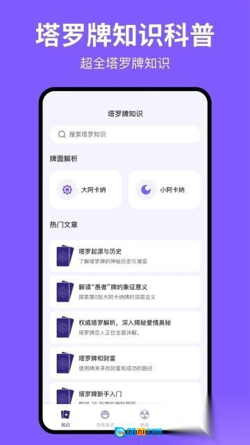在知识板块里,你能了解到大阿卡纳、小阿卡纳等相关内容,同时还有各类热门文章可供阅读。