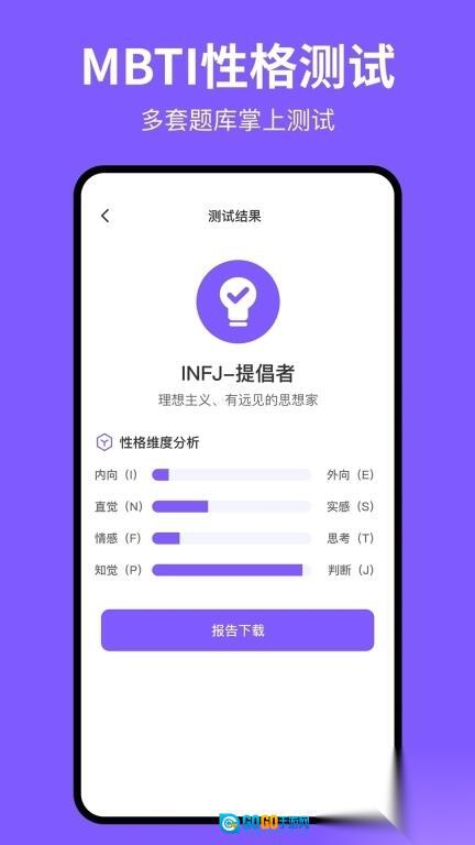 2、性格测试模块:借助40道专业题目精准测定MBTI人格类型,帮助你深入认识自身性格特点。