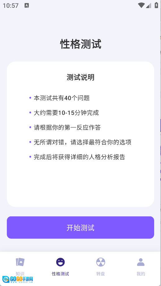 2、性格测试通过完成40道不同的题目来帮助了解自身性格,作答时需以第一反应为准。
