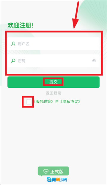你需要先输入用户名和密码,同时阅读并同意《服务政策》与《隐私协议》,完成这些操作后点击提交按钮,之后只需等待审核结果。一旦审核通过,你就可以用新注册的账号进行登录了。