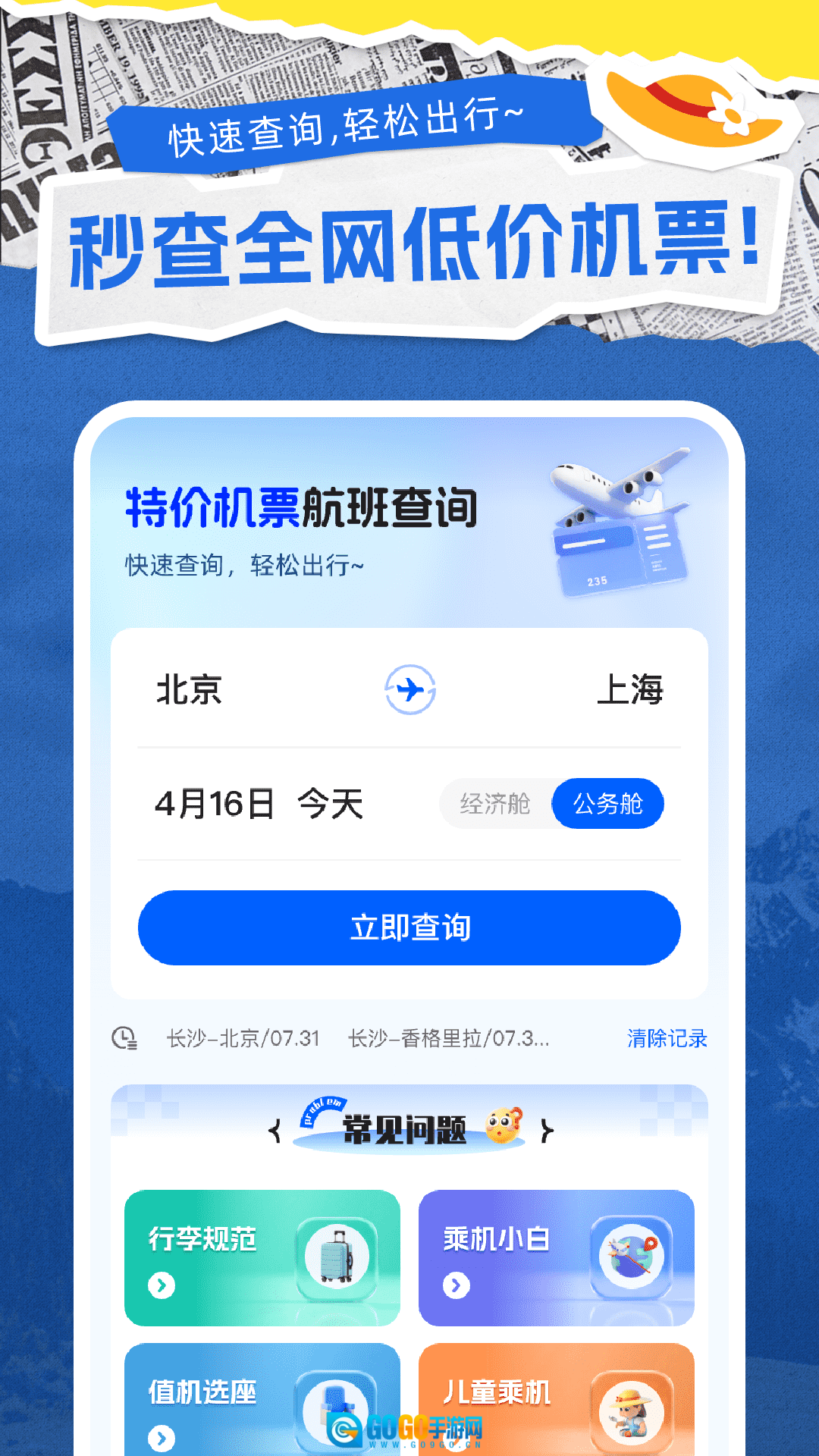 包含行李规定、初次乘机指南、值机与选座、儿童乘机须知等内容,为用户解答疑问。